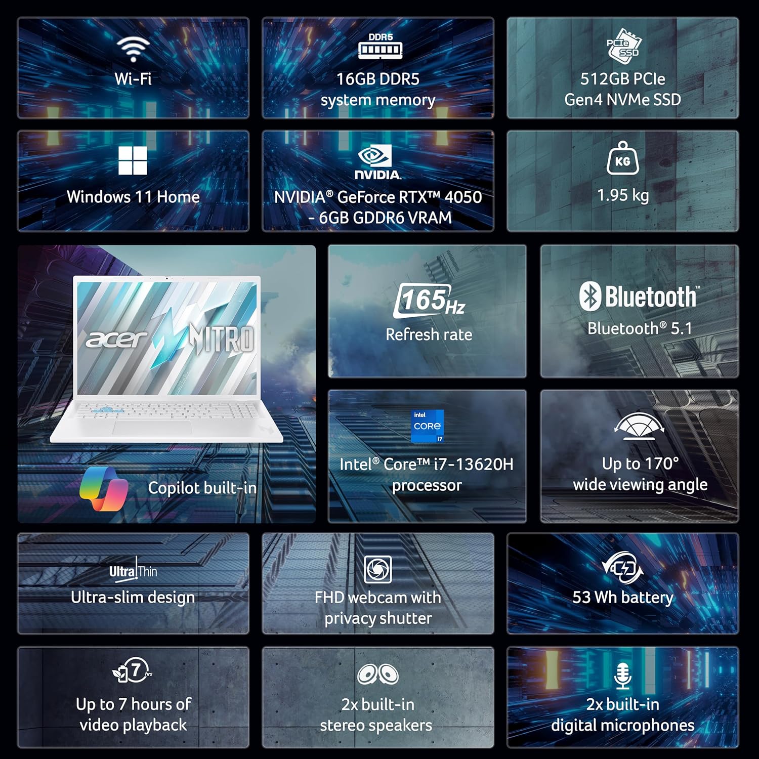 Acer Nitro Lite 16,Intel Core i7 13620H Processor,NVIDIA GeForce RTX 4050-6 GB GDDR6, 16GB/ 512 GB, 16.0″/40.64 cm, 165 Hz, Win 11 Home, White, 1.95 kg, NL16-71G, Backlit KB,Gaming Laptop