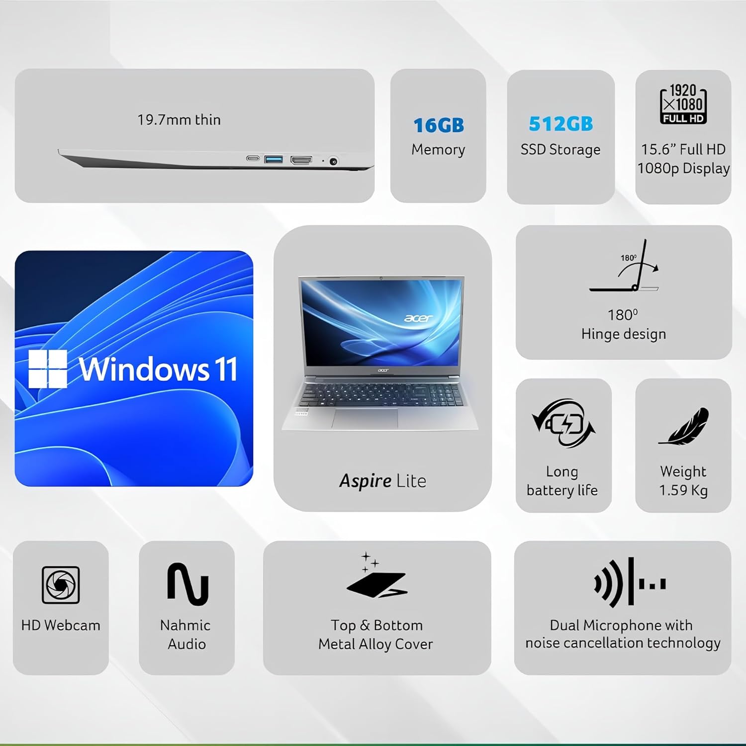 acer Aspire Lite (2025) AMD Ryzen 3 Quad Core 5300U – (16 GB/512 GB SSD/AMD Radeon Graphics/Windows 11 Home) AL15-41 Thin and Light Laptop (15.6 Inch FHD, Steel Grey, 1.5 Kg/MS Office 2021
