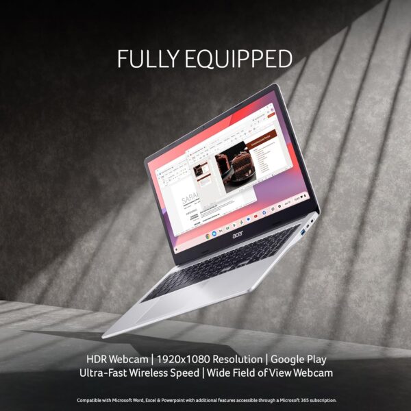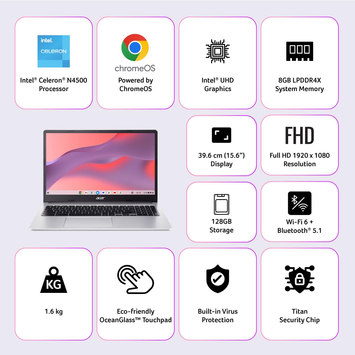 Acer Chromebook, Intel Celeron N4500, 8GB RAM, 128GB eMMC, Full HD LED Backlit TFT LCD 15.6″/39.6 cm, Chrome OS, Silver, 1.6 KG, CB315-4H, Intel Graphics, WiFi 6 Laptop