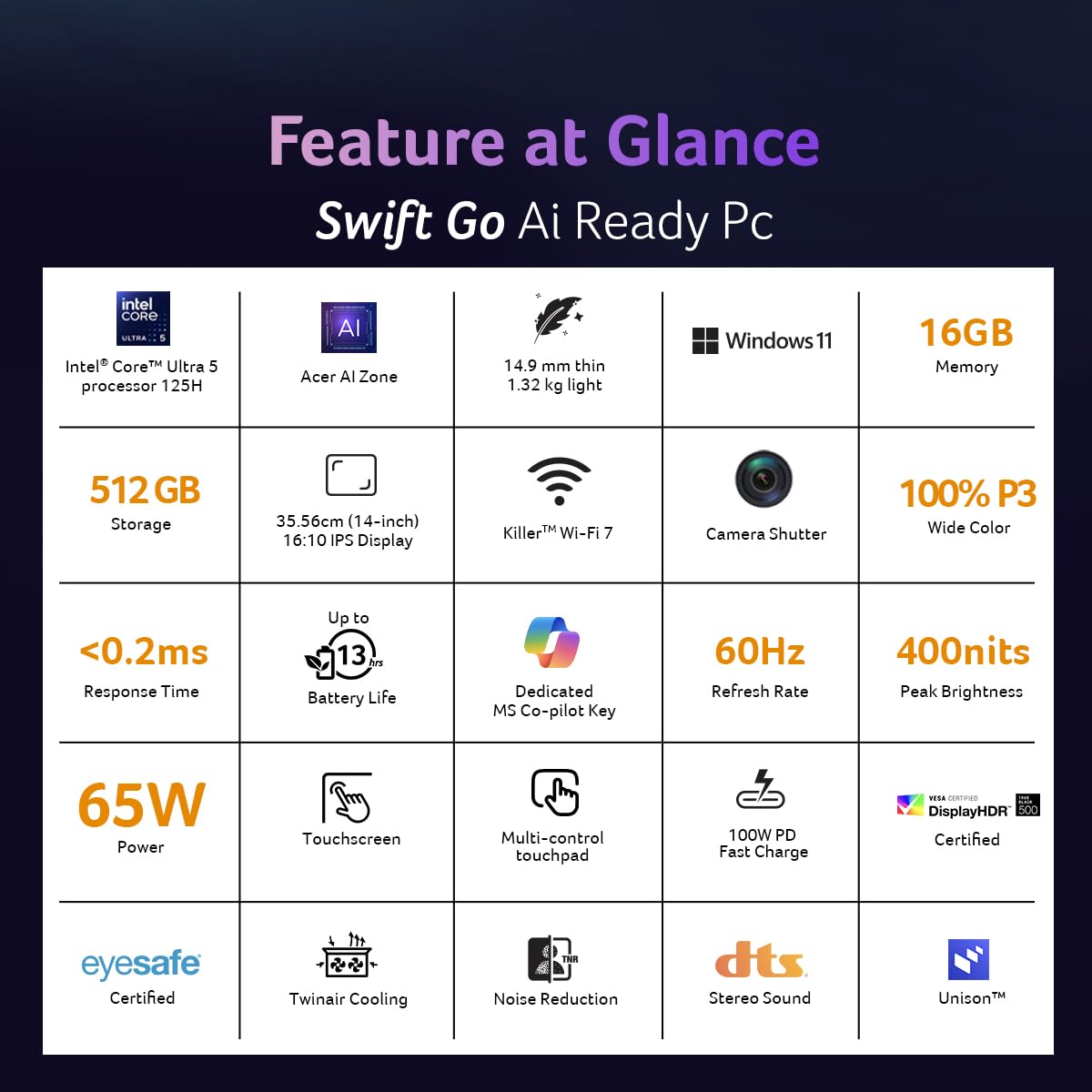 This is loaded with an array of perks to enhance your user experience. Enjoy video calling on the 1440p QHD webcam, quick charge at up to 100W on the USB-C port, and customize your PC experience even further with the Acer Sense app.