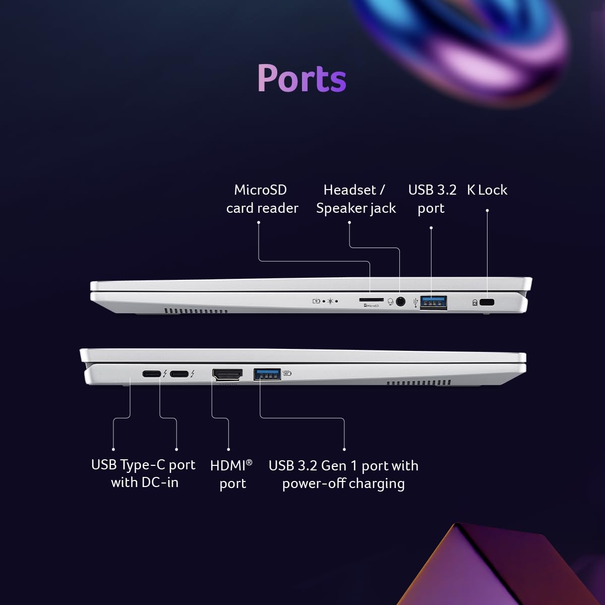 Boasting 2 USB 3.2 ports, 2 USB Type C ports with DC-in, HDMI port, Wi-Fi 7, Bluetooth, Audio, and a MicroSD slot, the Swift Go has all the essential connections to keep your productivity powered on!