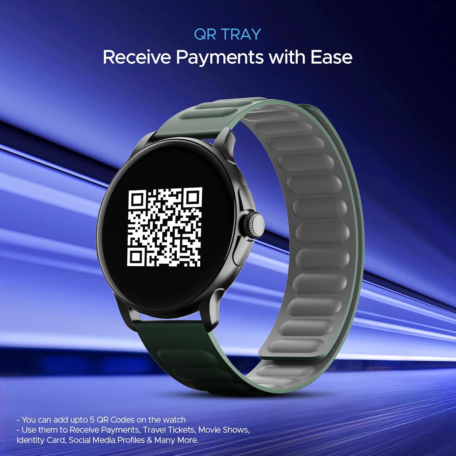 The QR Tray feature makes accessing important information easier. Simply save your QR Codes on your watch through the Crest app and keep them ready.