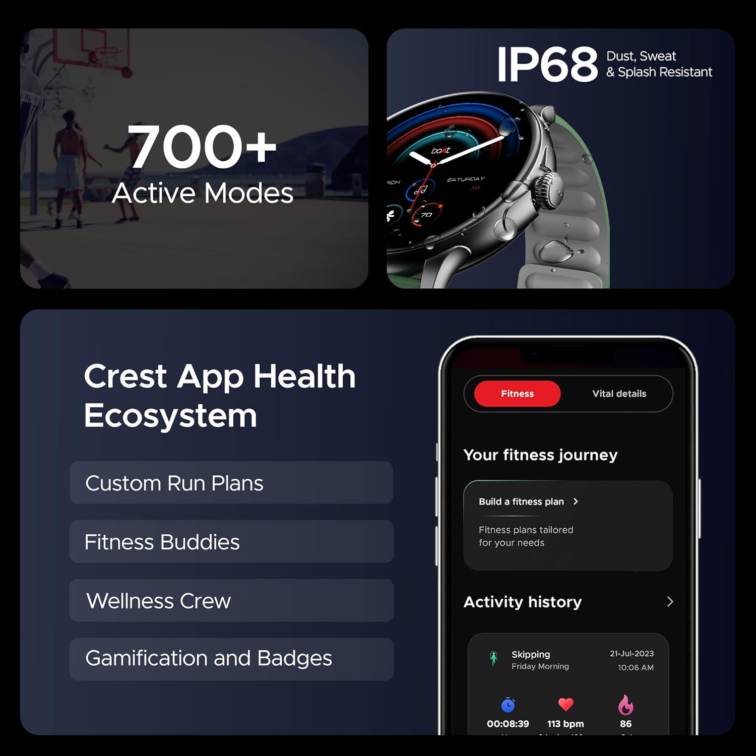 IP68 Dust, Sweat & Splash Resistance: Designed to withstand the elements, this smartwatch offers protection against dust, sweat, and water splashes.