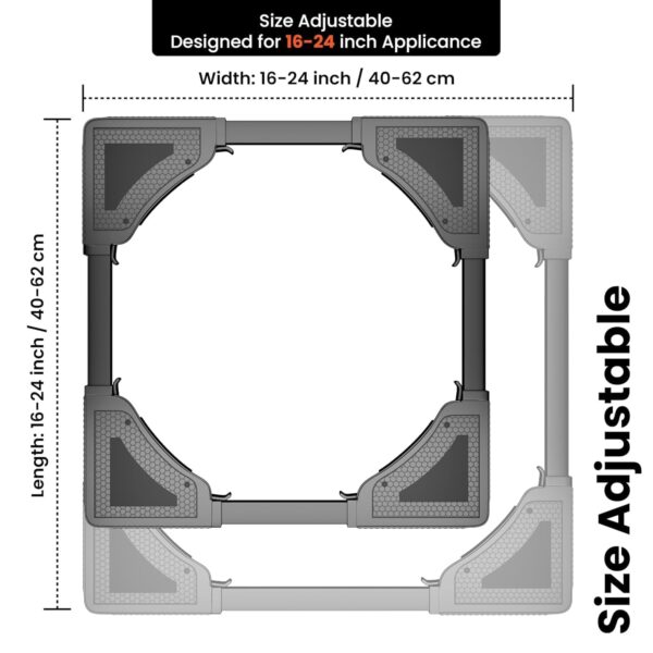 𝐀𝐝𝐣𝐮𝐬𝐭𝐚𝐛𝐥𝐞 𝐁𝐚𝐬𝐞 𝐒𝐢𝐳𝐞: The washing machine stand (Semi Automatic and Fully Automatic) size can be adjusted. Min: 16.5 inches X 19.5 inches (inner) to Max: 25.5 inches X 32 inches (inner), Height – 4 inches. Please measure your machine’s size first when you order!