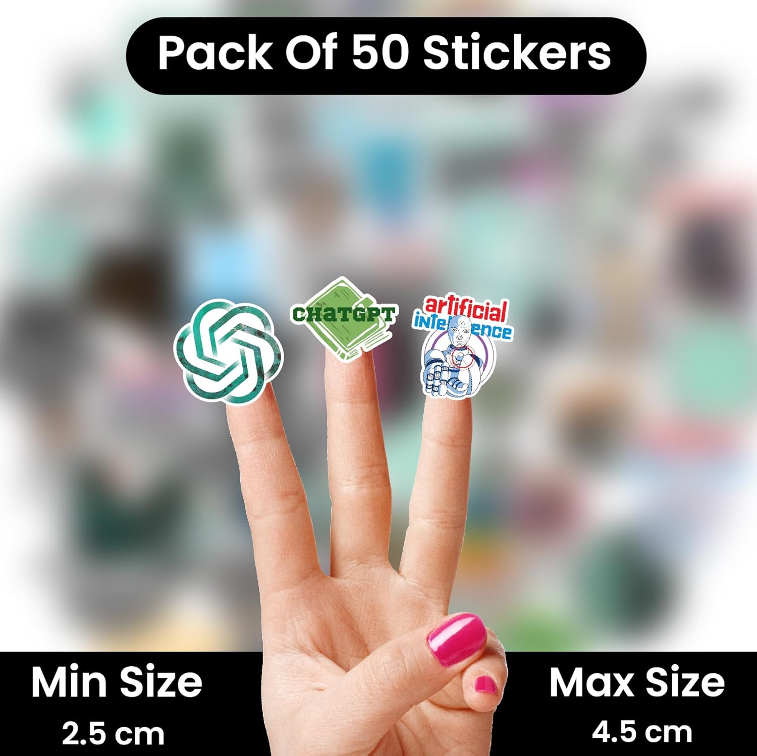 Level up your gear with our exclusive pack of good quality ChatGPT and AI-themed stickers. This is the perfect collection for every programmer, developer, AI enthusiast, and student who lives and breathes technology. Each sticker in this pack is designed to add a touch of personality and tech-savvy humor to your everyday items. Crafted from durable, waterproof, and fade-resistant vinyl, our stickers are built to last. They can withstand daily wear and tear, ensuring the vibrant colors stay bright and bold on your laptop, water bottle, or phone case. The strong adhesive ensures they stick firmly, but can be easily removed without leaving any sticky residue. Searching for a unique gift for a coder, a software engineer, a data scientist, or an IT student? Look no further! This sticker bundle is an ideal present for birthdays, holidays, or as a thoughtful gesture to a fellow tech enthusiast. Each sticker is approximately 2.5 cm and maximum size is 4.5 cm.