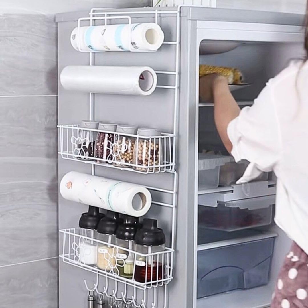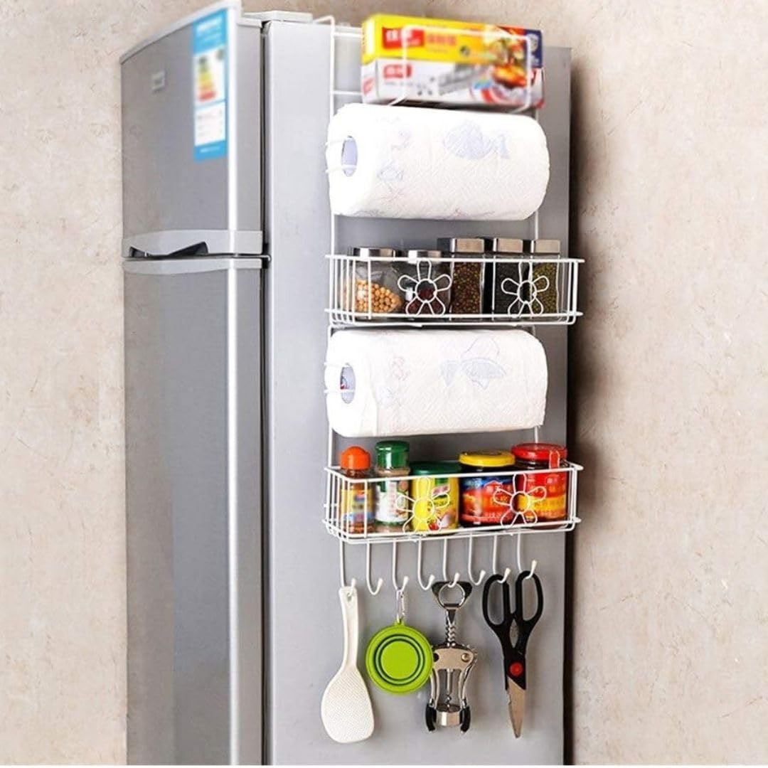 Decorlay Metal Self-Adhesive Multi-Layer Refrigerator Broadside Floating Shelves Rack Storage Hanging Organizational Fridge Side Rack Tissue Roll Holder Kitchen Organizer | Color-White