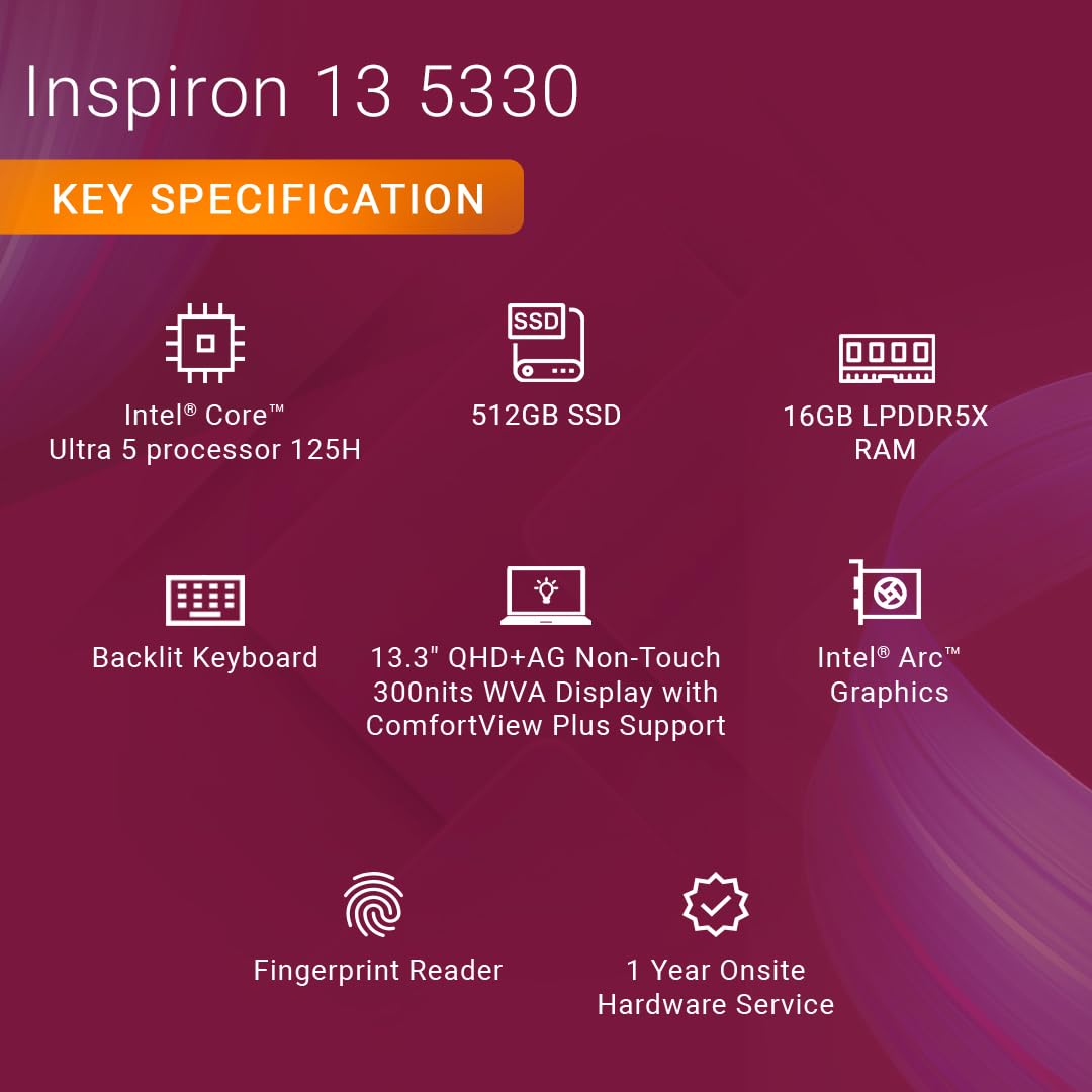 2 reviews for Dell New Inspiron 13, Intel Core Ultra 5-125H, 16GB RAM, 512GB SSD, QHD+ 13.3″/33.78cm, Windows 11, MS Office 2021, Silver, 1.24Kg, Backlit KB, FPR, AG 300nits AI Powered Laptop