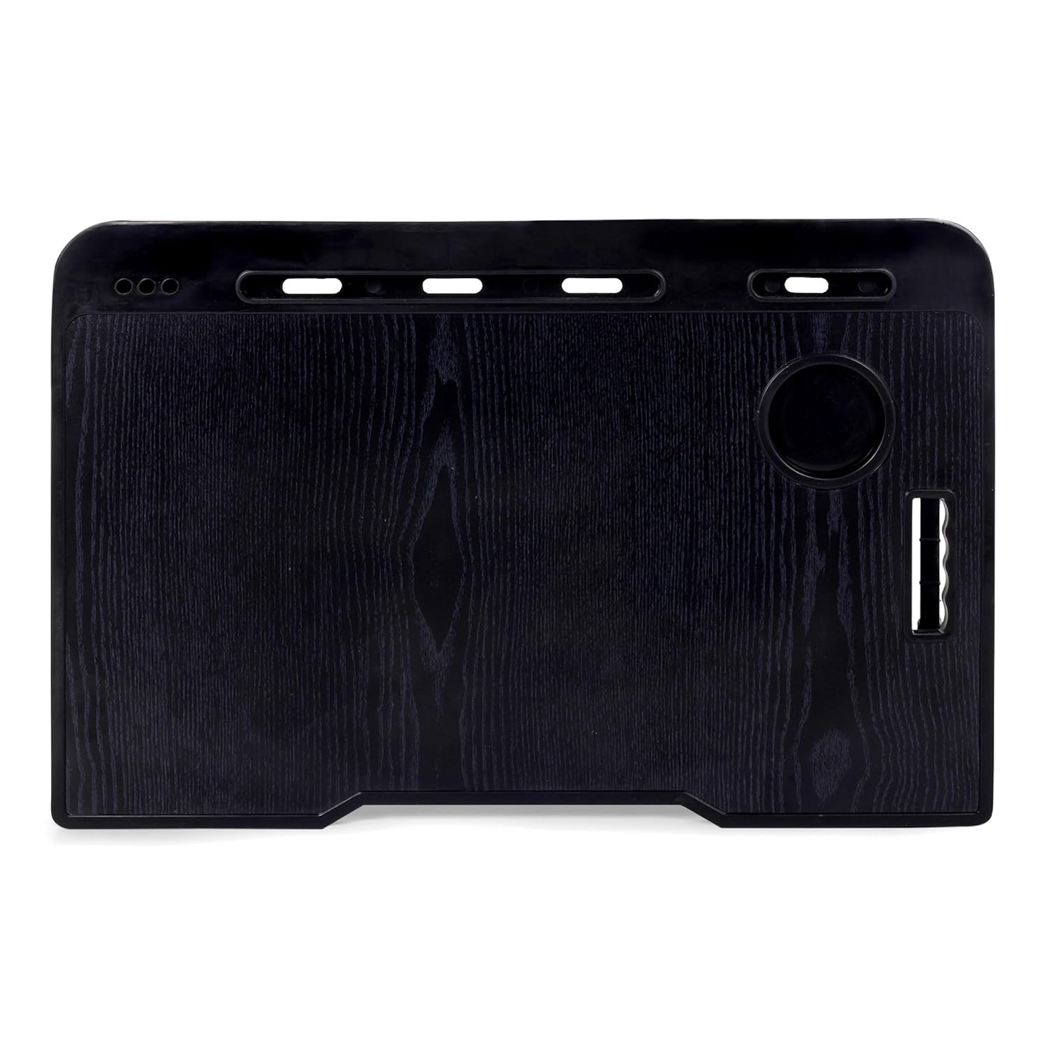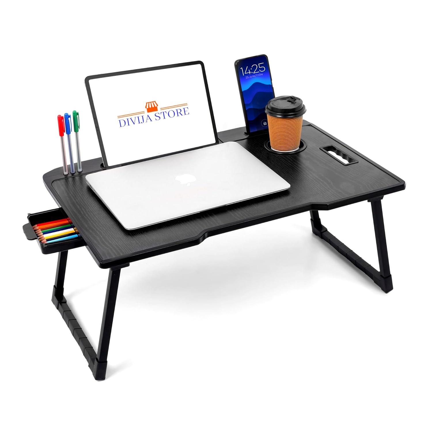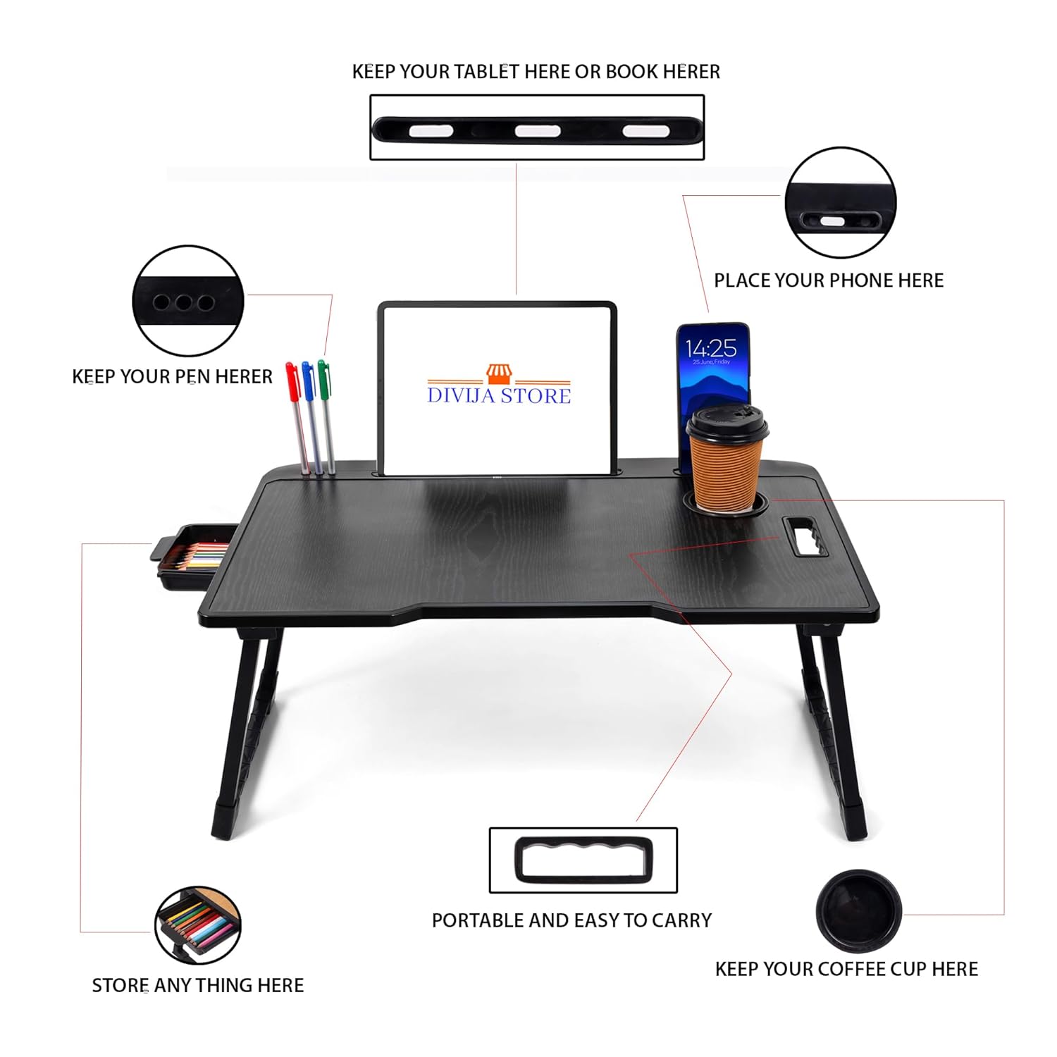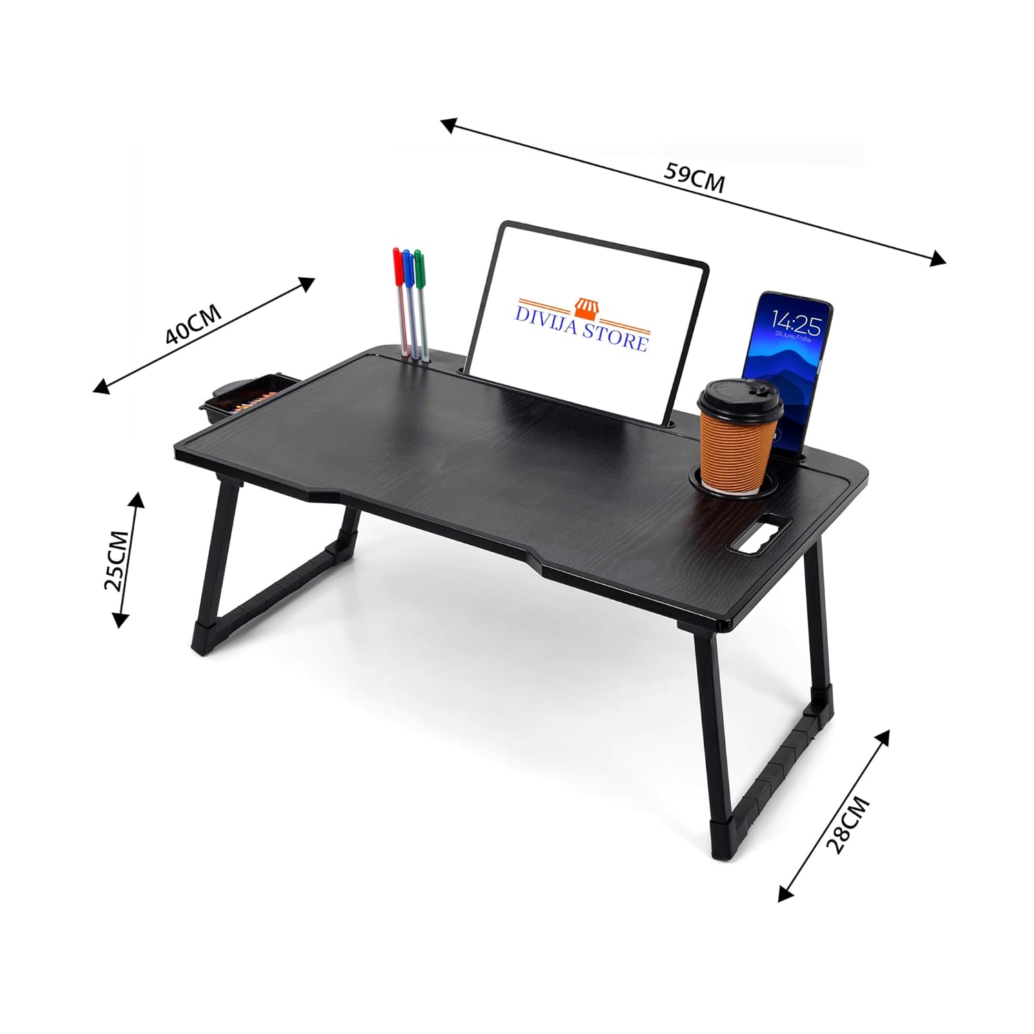 DIVIJA STORE Wood Smart Multipurpose Foldable Laptop Table with Cup Holder, Study Table, Bed Table, Breakfast Table, Foldable and Portable/Ergonomic & Rounded Edges/Non-Slip Legs (Black), 59 cm, 8 cm