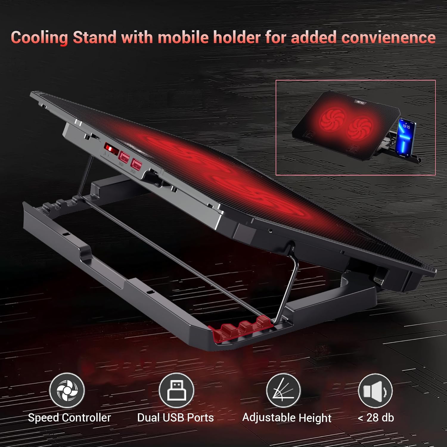 Dracula 20 Laptop Cooling Pad, Laptop Cooler with Mobile Holder 2*1 125mm Quite Fans at 1000 RPM, Fan Speed Controller 5 Height Adjustable Angle 2 USB Ports Compatible for Laptop up to 15.6”