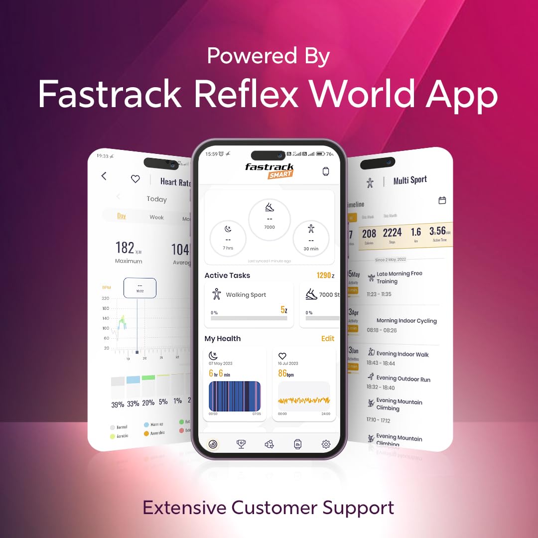 Giving you the ultimate experience where Style meets Fashion-Tech. Introducing the all Limitless Classic with a large 1.91″ UltraVU hd Display with Industry best 320 x 385 Pixel Resolution in brand new colours with Functional Crown, where we provide your handy kit right on your wrist with SingleSync BT Calling, advanced 100+ Multisport Tracker, 100+ Watchfaces, In-Built Games, Calendar, Calculator, and much more, all in a massive 7 Day Battery Life. We got your health covered with deep personalized insights in our Fastrack Reflex World App.