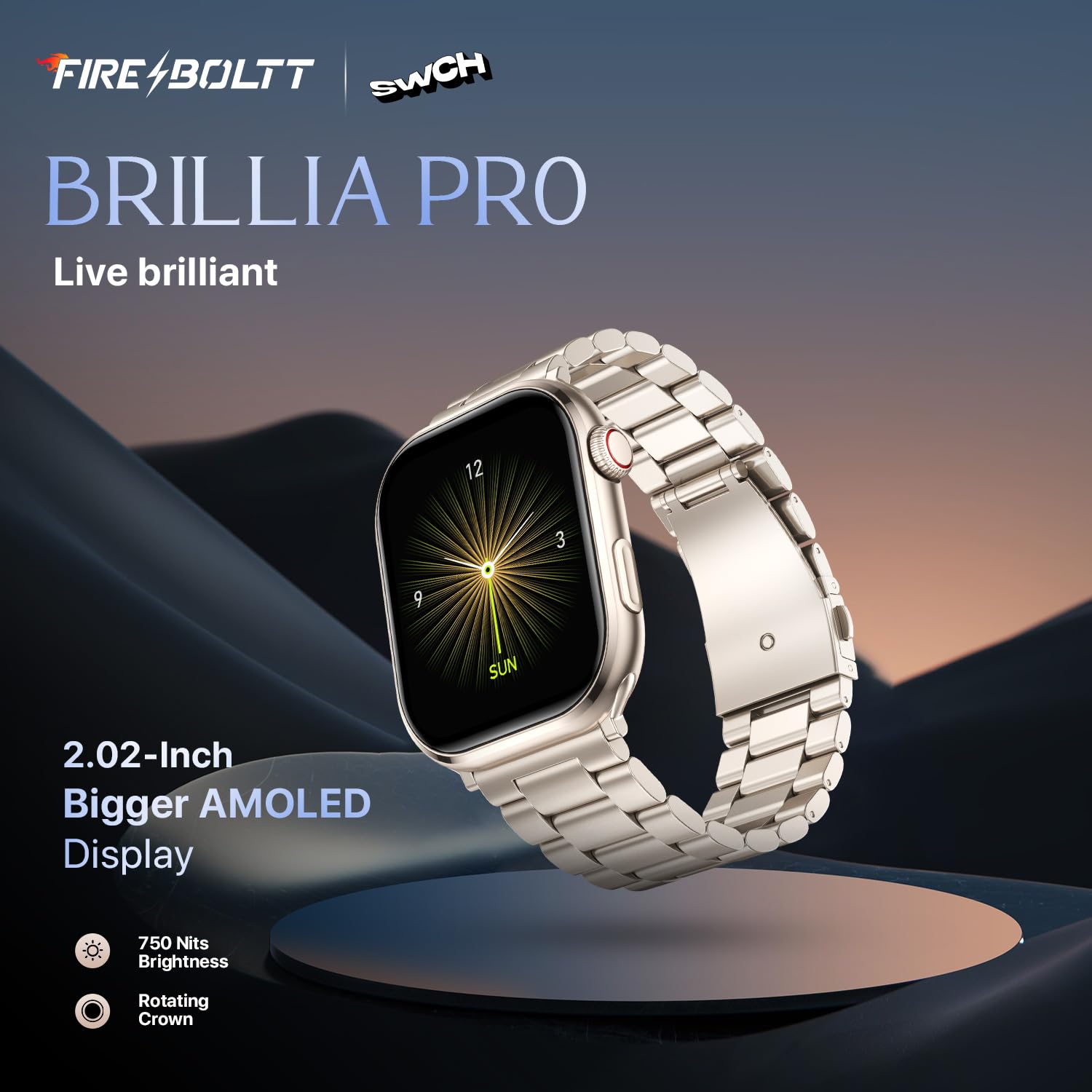 8 reviews for Fire-Boltt Brillia Pro Smart Watch 2.02″ Super AMOLED Display with Bluetooth Calling, SPO₂ & Heart Rate Monitor, 120+ Sports Modes, IP67 Waterproof Metal Smartwatch for Men & Women – Champagne