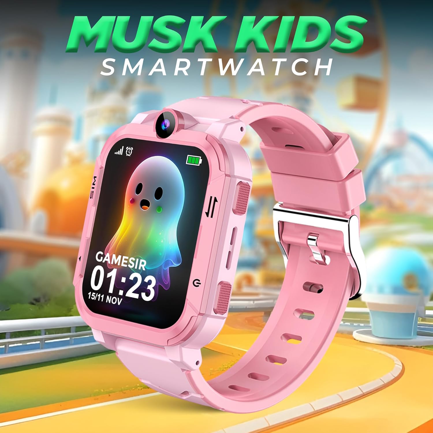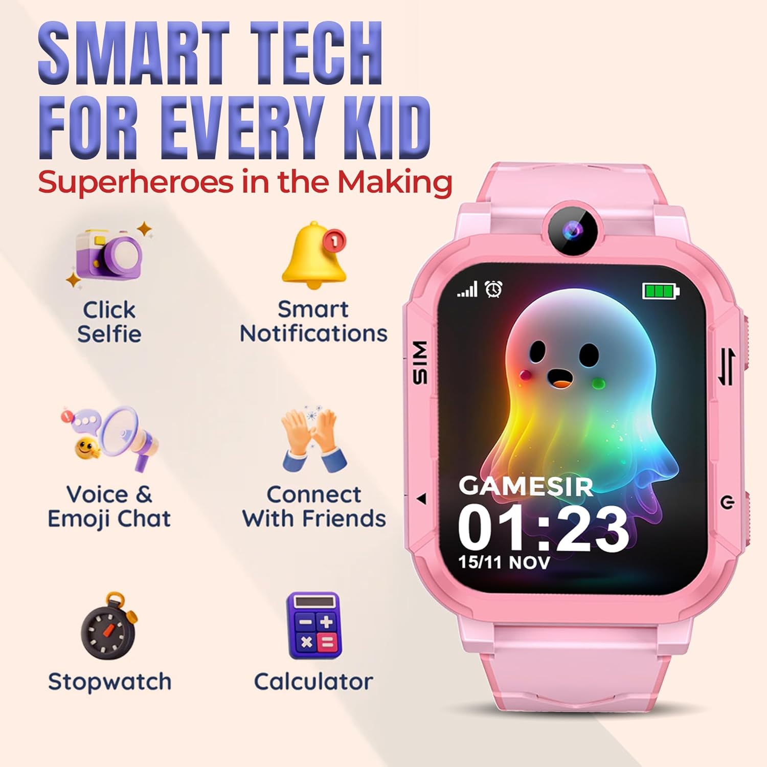 GameSir Musk PRO 5G/4G Kids Smart Watch with GPS Tracker, SIM Calling, Face Unlock, Video Calls, SOS Alerts, IP67 Waterproof, 800mAh Battery, Voice Chat, Live Location(Main -Colour) (Pink)