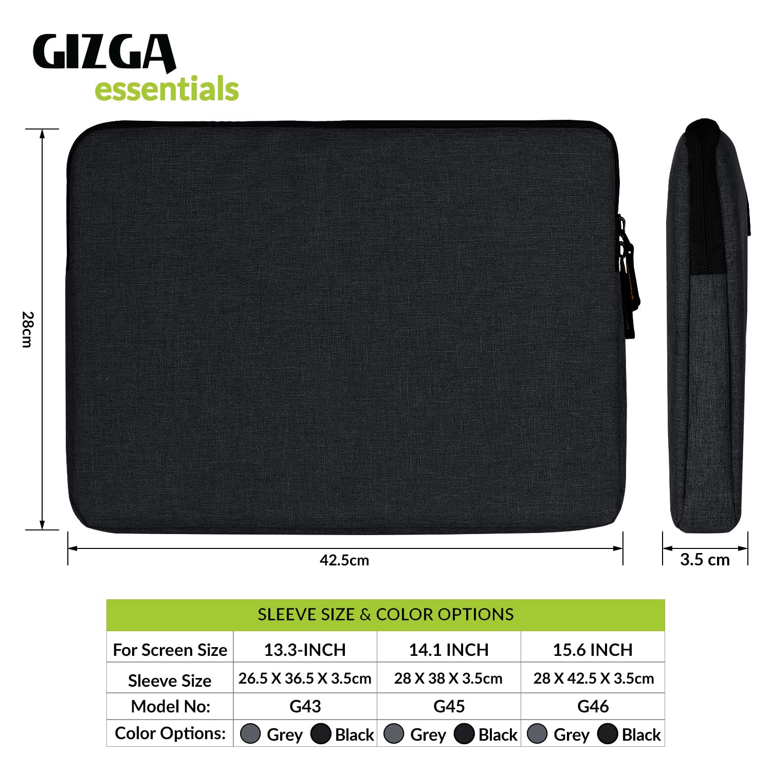 Gizga Essentials 15.6 Inch Laptop Sleeve Case Cover Pouch Bag with Front Pocket| Slim & Water-Resistant Nylon Fabric with Shockproof Foam Padding, Soft Lining & Premium Zipper Closure (Black)