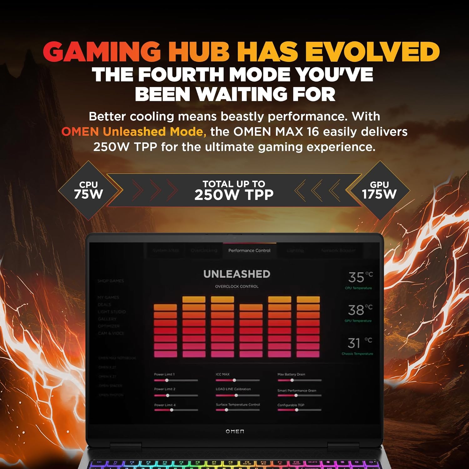 OMEN Unleashed Mode drives up to 250W TPP (CPU+GPU) under ≤25°C ambient. Push thermal ceilings, unlock peak FPS, and gain every advantage in fast-paced, high-load titles without compromising stability.
