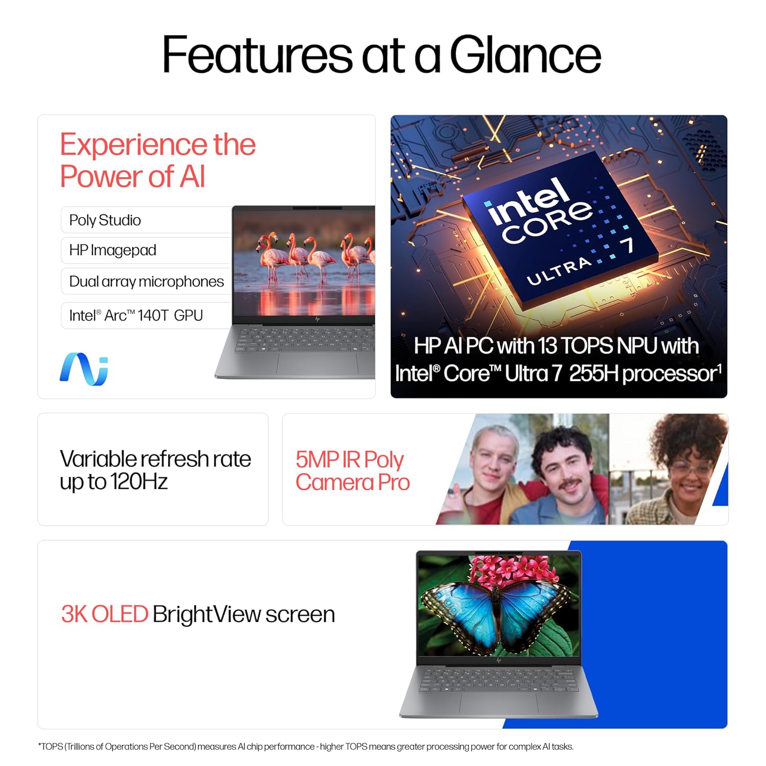 Display & Graphics: 35.6 cm (14″) diagonal, 3K (2880 x 1800), OLED, 48-120 Hz, 0.2 ms response time, UWVA, micro-edge, BrightView, Low Blue Light, SDR 400 nits, HDR 500 nits, 100% DCI-P3|Graphics: Intel Arc 140T GPU