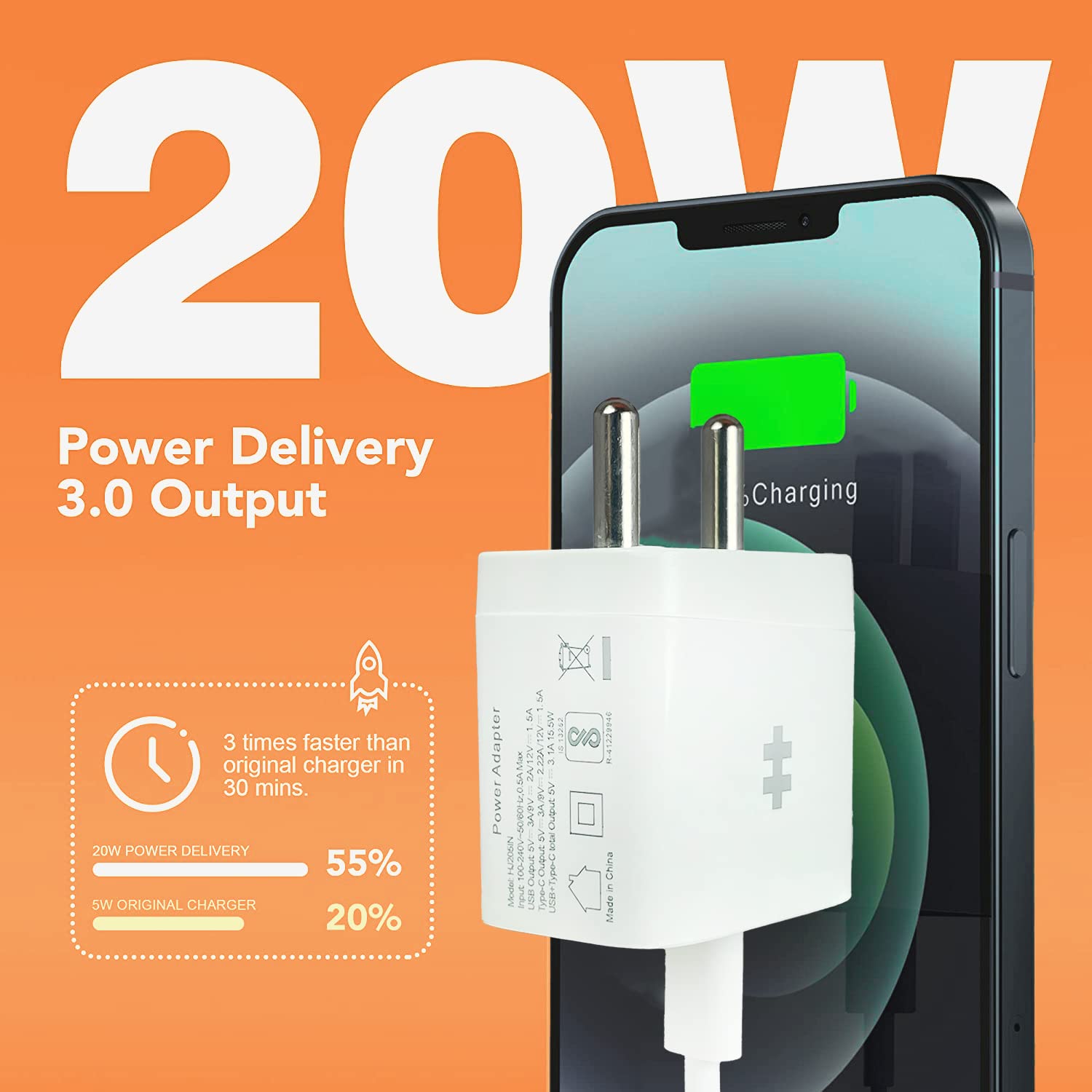 Supports 38 Watt power delivery ( 20 Watt USB-C + 18 Watt USB-A ) with fast charging
