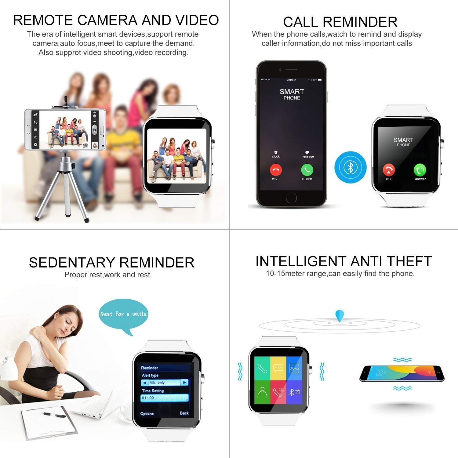 Alarm clock, two-way anti-lost reminder, and support for taking photos and videos with ample 16GB memory capacity.