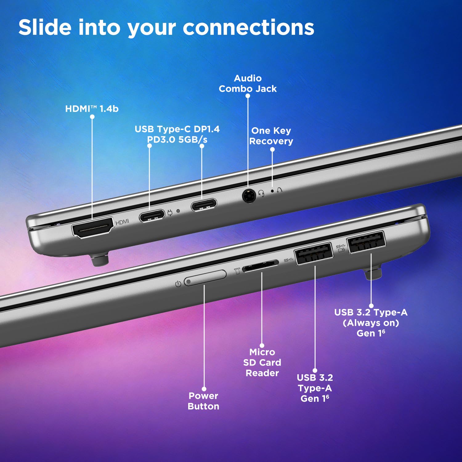 Ports: 1x USB-A (USB 5Gbps / USB 3.2 Gen 1) | 1x USB-A (USB 5Gbps / USB 3.2 Gen 1), Always On | 2x USB-C (USB 10Gbps / USB 3.2 Gen 2), with USB PD 3.0 and DisplayPort 1.4 | 1x HDMI 2.1, up to 4K/60Hz | 1x Headphone / microphone combo jack (3.5mm) | 1x microSD card reader