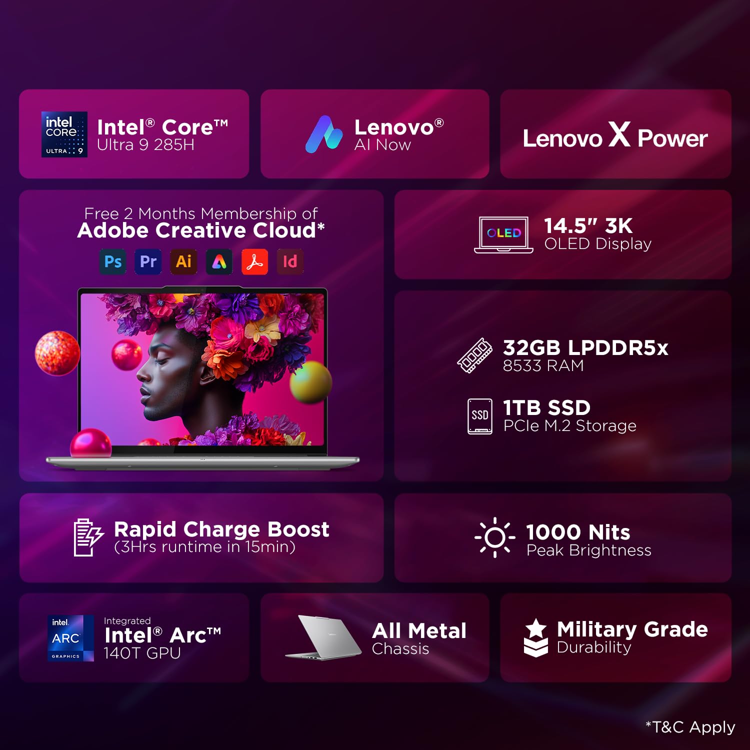 Lenovo Yoga Pro 7 Aura Edition, Intel Evo Core Ultra 9 285H, 32GB RAM, 1TB SSD, 3K OLED, Copilot+ PC, 14.5″/36.8cm, Touchscreen, Win 11, Office 24, AI Now, Grey, 1.5Kg, 83KF001LIN, AI Powered Laptop