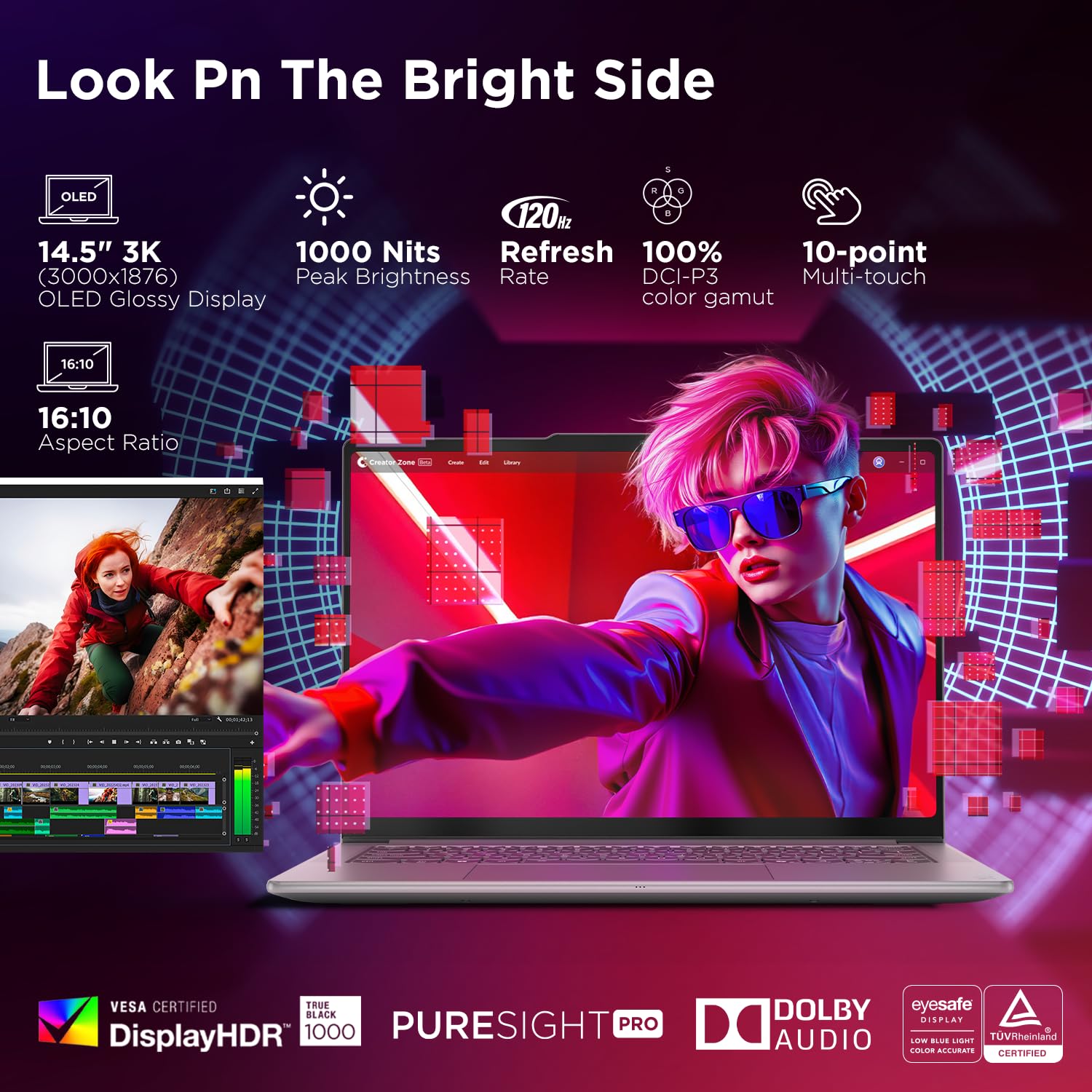 Display: 14.5″ 3K OLED (3000×1876) | Touchscreen | 1000Nits Peak Brightness, 500Nits Typical Brightness | 120Hz Refresh Rate | 100% DCI-P3 |DisplayHDR True Black 1000 | X-Rite, PureSight Pro| Dolby Vision | Anti Glare |TUV Low Blue Light Certified
