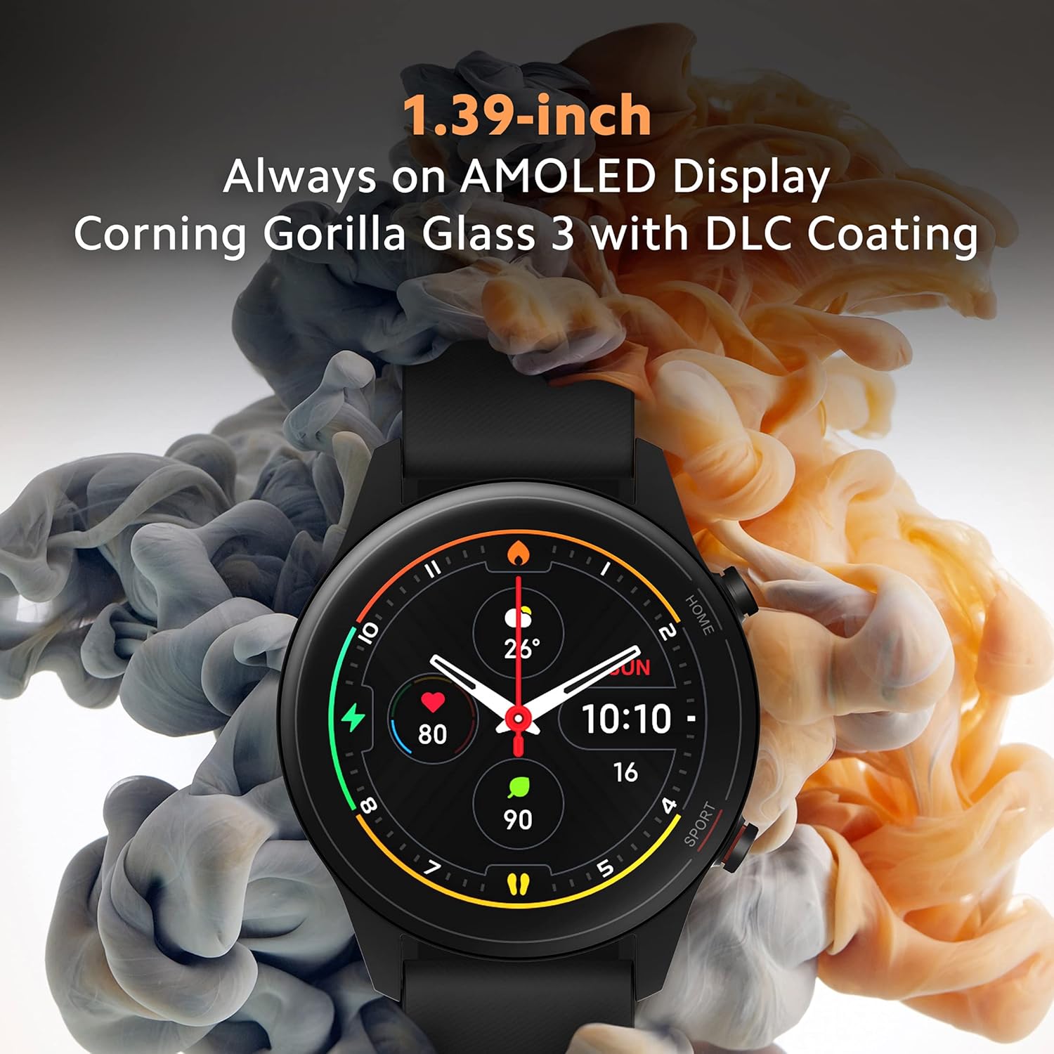 Design and Display: 1.39” Always-on AMOLED Display with 450 nits of brightness and DLC coating for scratch resistance