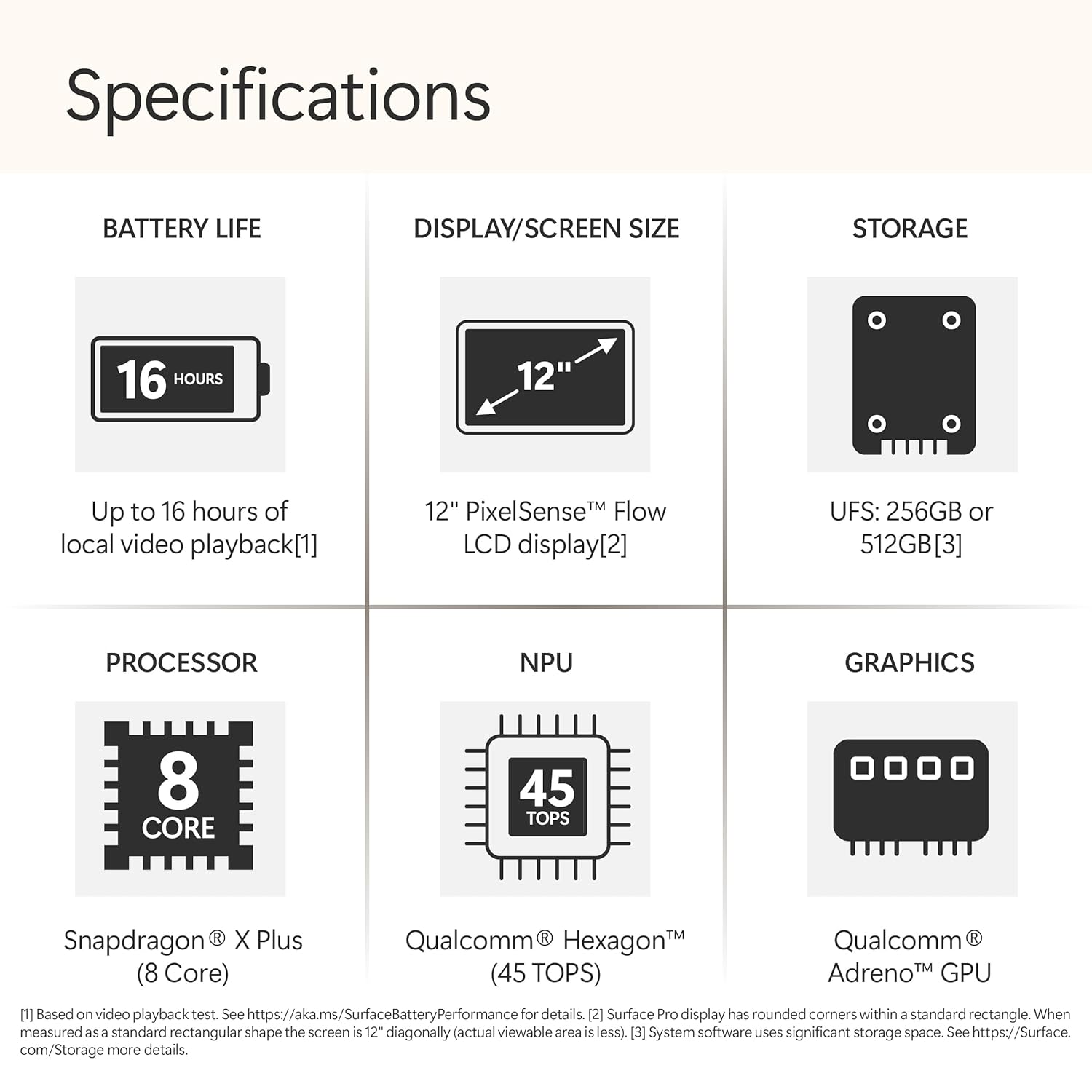 Built with the latest Qualcomm Snapdragon X Plus (8 Core) processors, Surface Pro delivers impressive performance and features a NPU with up to 45 TOPS designed to accelerate AI experiences.