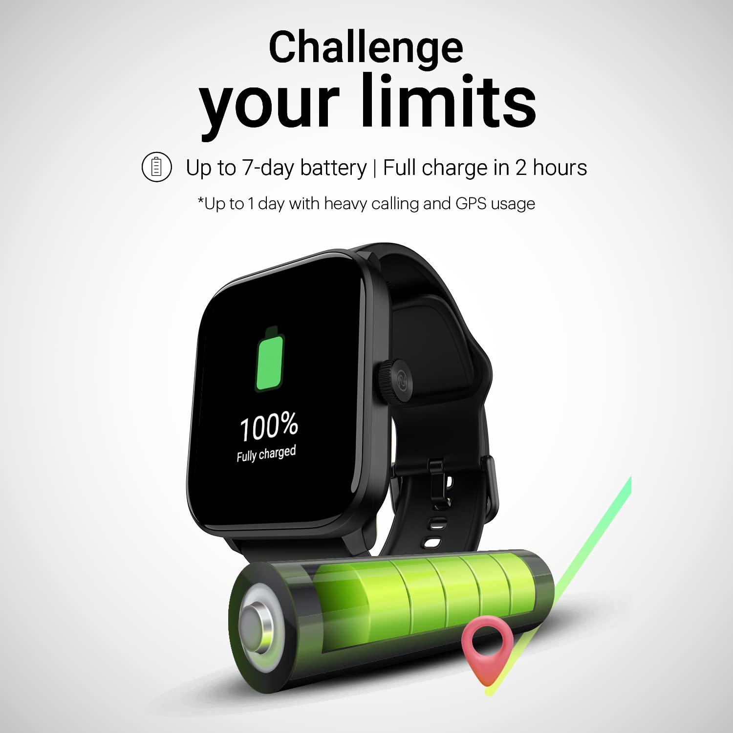 Up to 7-day battery: Breeze through an entire week without charging with up to 7 days of battery life as per the usage. Get up to 1 day of battery life when calling and GPS is enabled.