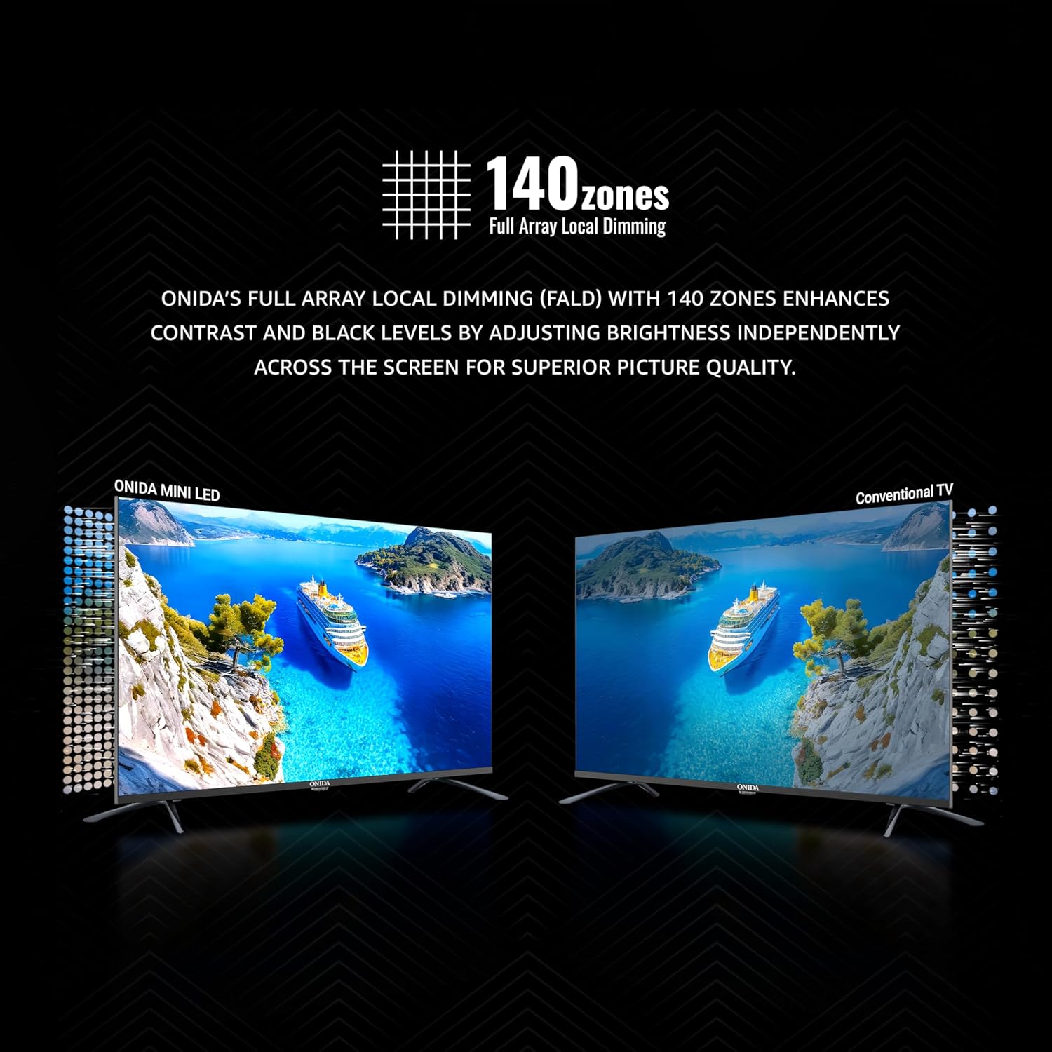 Onida’s FALD with 140 zones boosts contrast, deep blacks, vivid colors and superior picture quality.