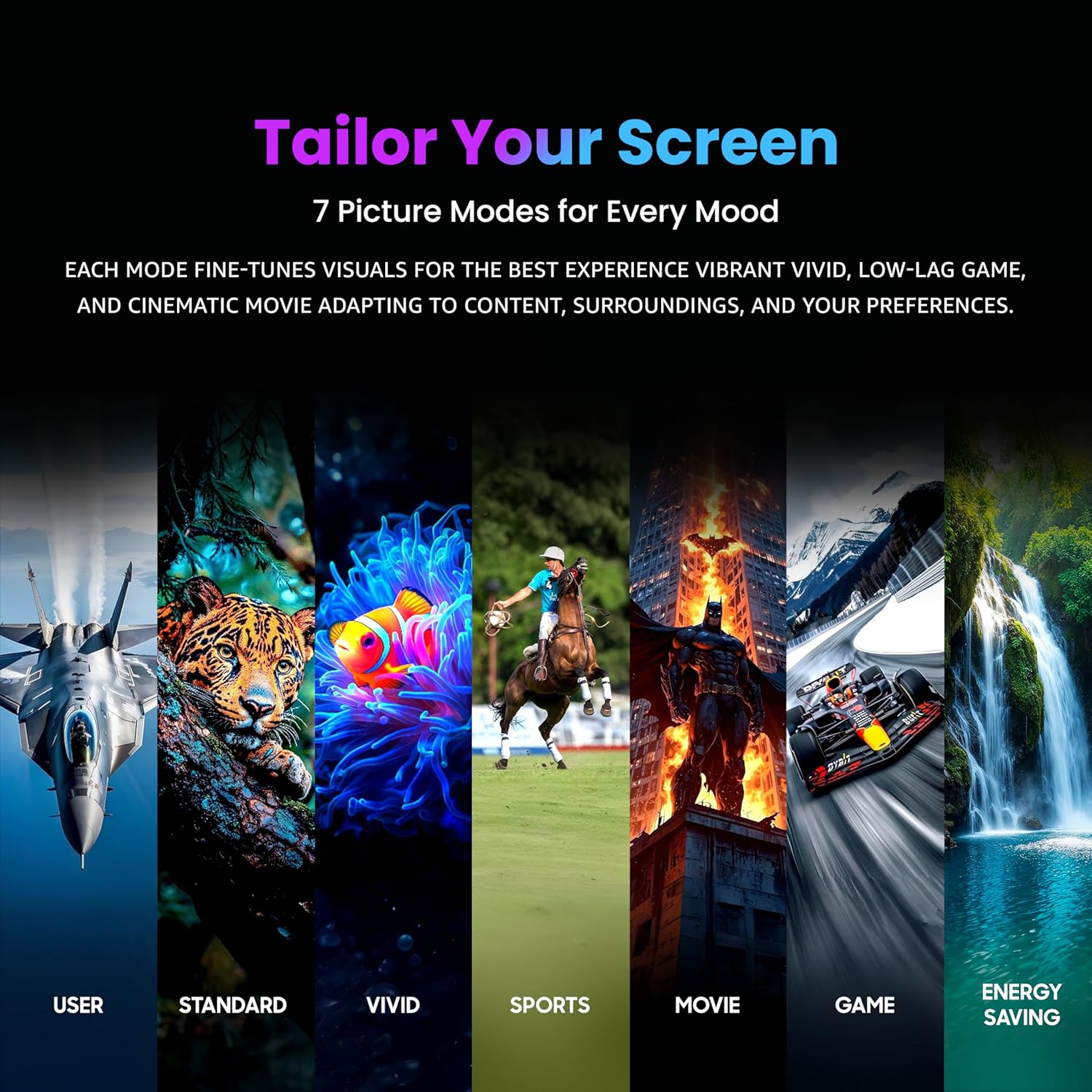 Each mode fine‑tunes visuals for the ideal experience: Vivid boosts brightness & color, Game mode minimizes lag for responsive gameplay and Movie/Cinema mode delivers accurate tones & rich contrast. Your screen adapts to content, environment and preference.