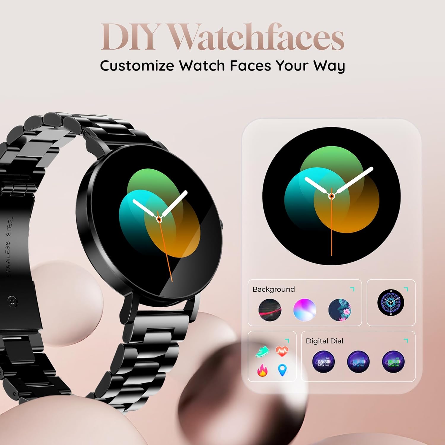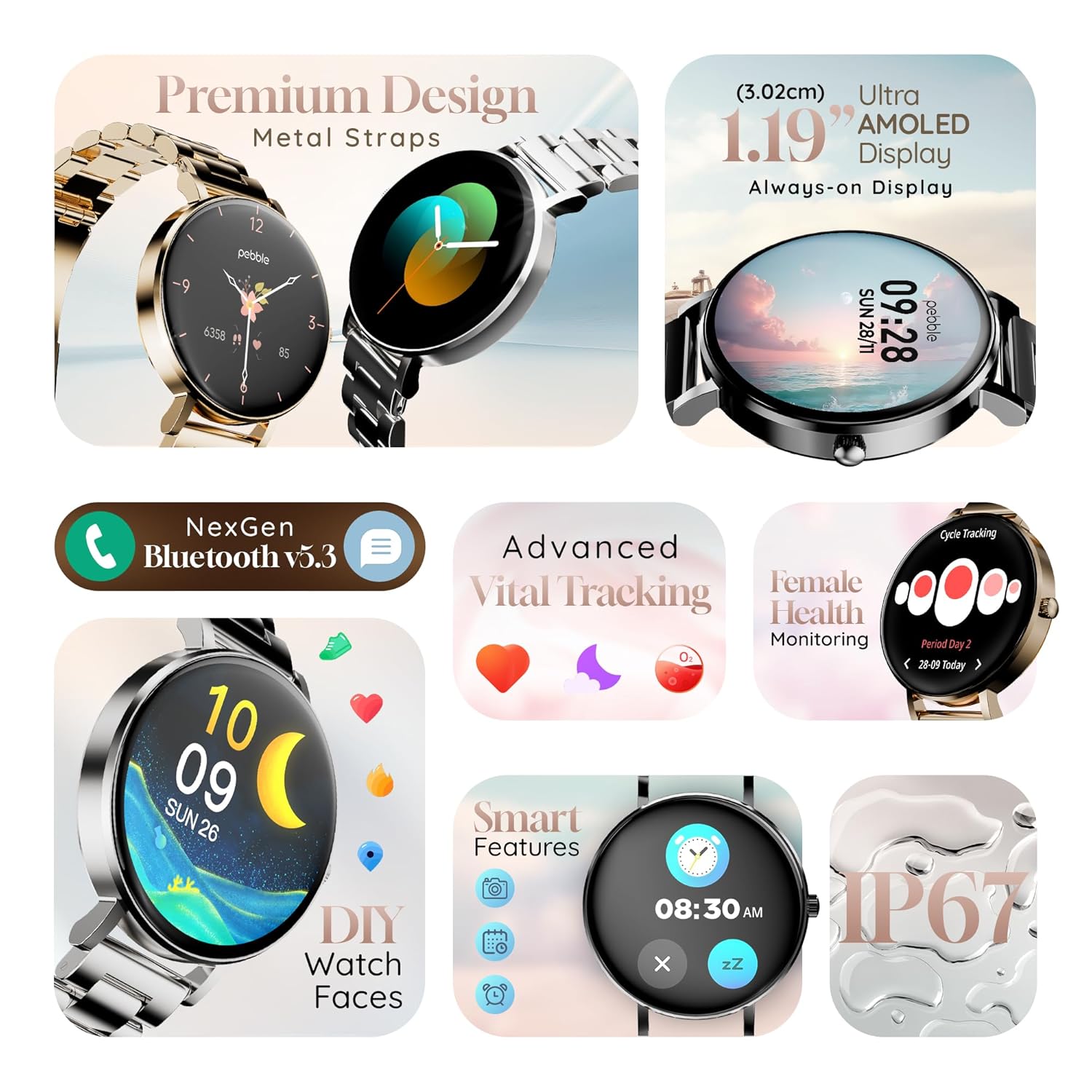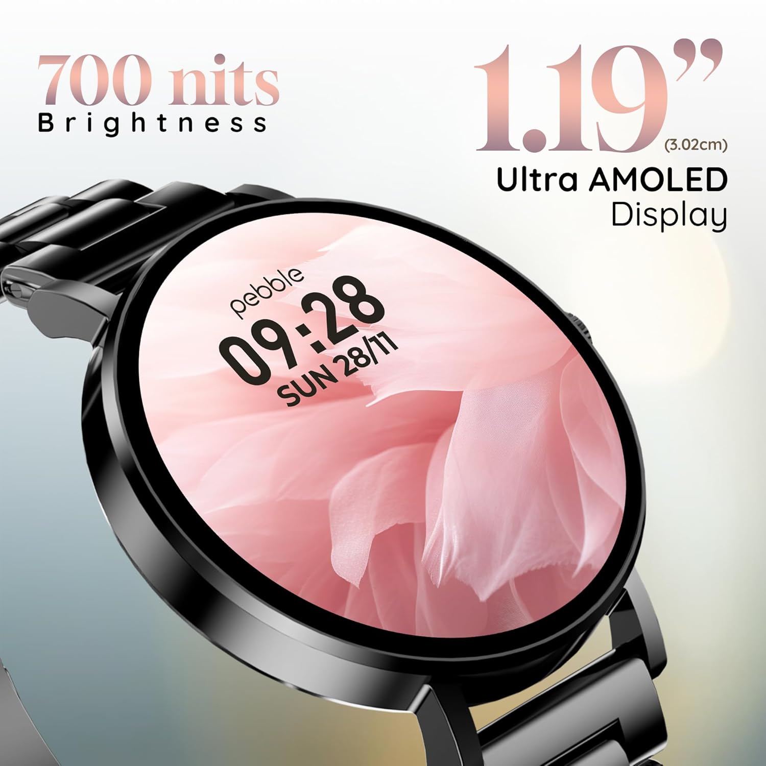 Pebble Eve 1.19” Ultra AMOLED Smartwatch 700 Nits, Bluetooth Calling Smart Watch for Women, Female Health Tracker, Stainless Steel Strap, IP67, DIY Faces, Smart Sensors, BT 5.3 – Classic Black