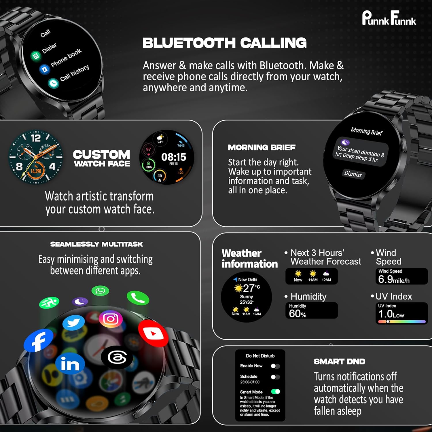 **”PunnkFunnk EVO Vista Smartwatch is a stylish and lightweight watch, perfect for everyday use. It comes with a bright 1.3” HD display, Bluetooth calling for easy communication, and fitness features like heart rate and sleep tracking to keep you on track. With 100+ sports modes, it’s great for workouts, and its IP67 waterproof rating makes it safe for daily activities. Compatible with both Android and iOS, this watch is a smart, budget-friendly option for style and utility.”**