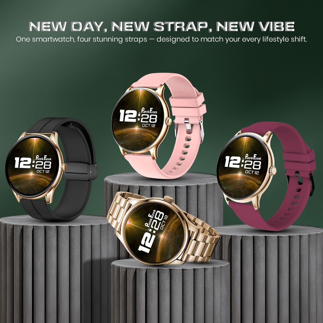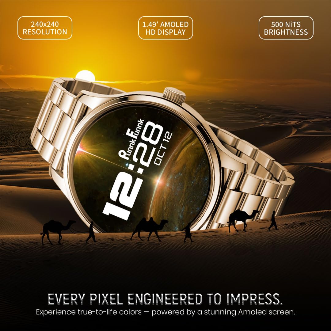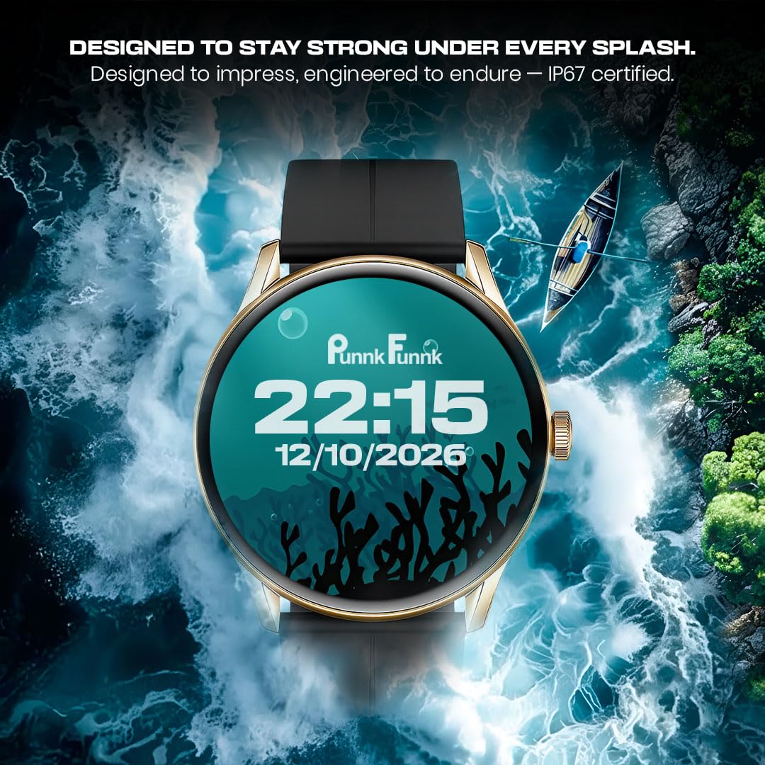 PunnkFunnk H20 Gold Dial Smart Watch Combo 1.49″ AMOLED Display with 4 Straps, Crown Control, Bluetooth Calling, 100+ Sports Modes, IP67, SPO₂ & Health Tracking, for Men & Women (Gold Dial)