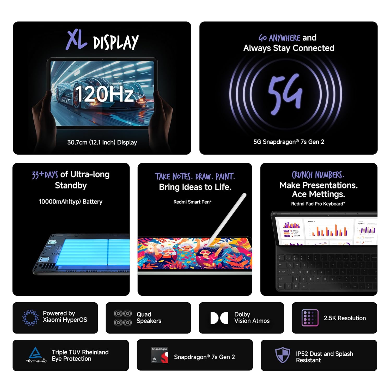 Redmi Pad Pro| Snapdragon 7s Gen 2| 30.7cm(12.1) Tablet| 33+ Days Standby|10000mAh| HyperOS| 120Hz|6GB, 128GB| Quad Speakers|Wi-Fi 6| Graphite Grey