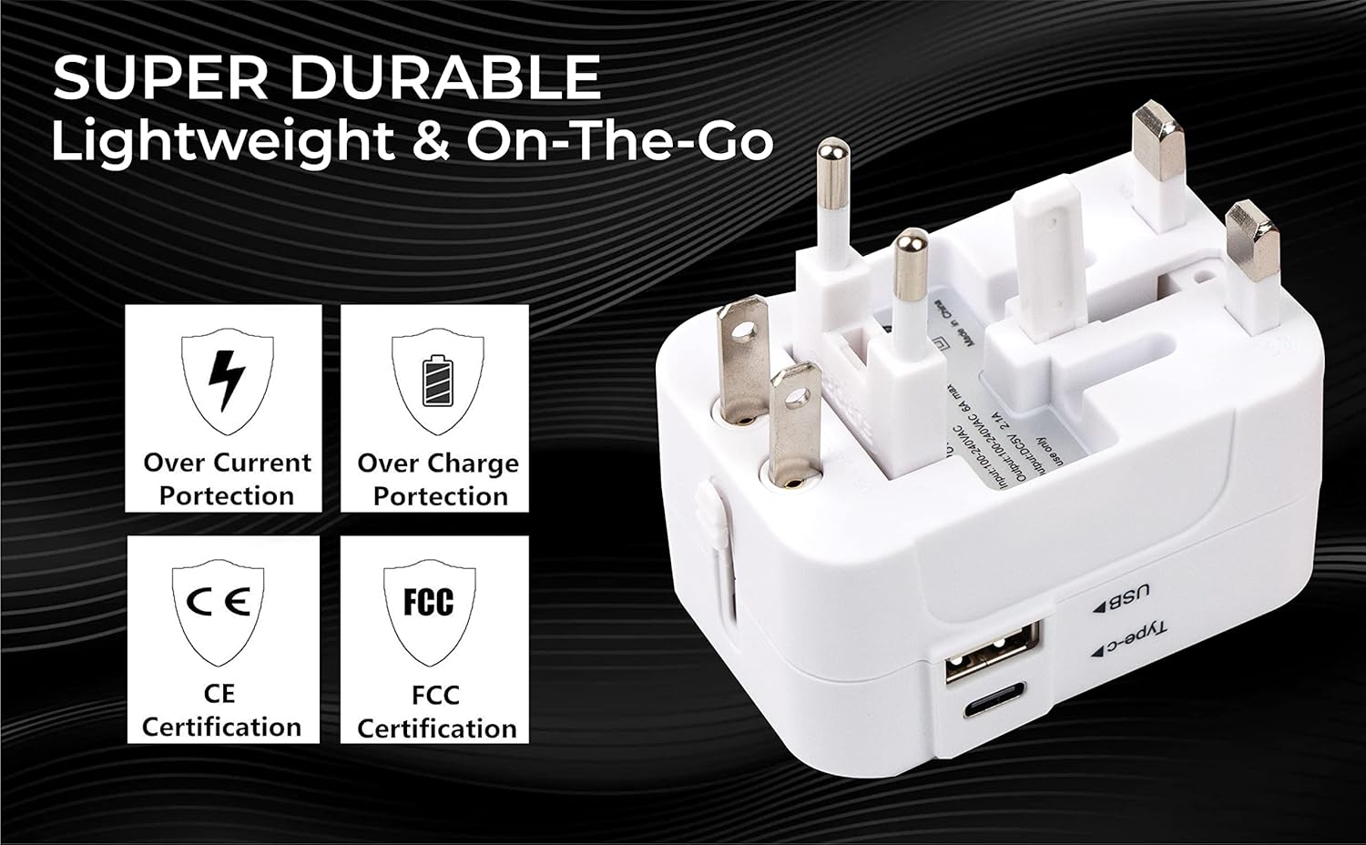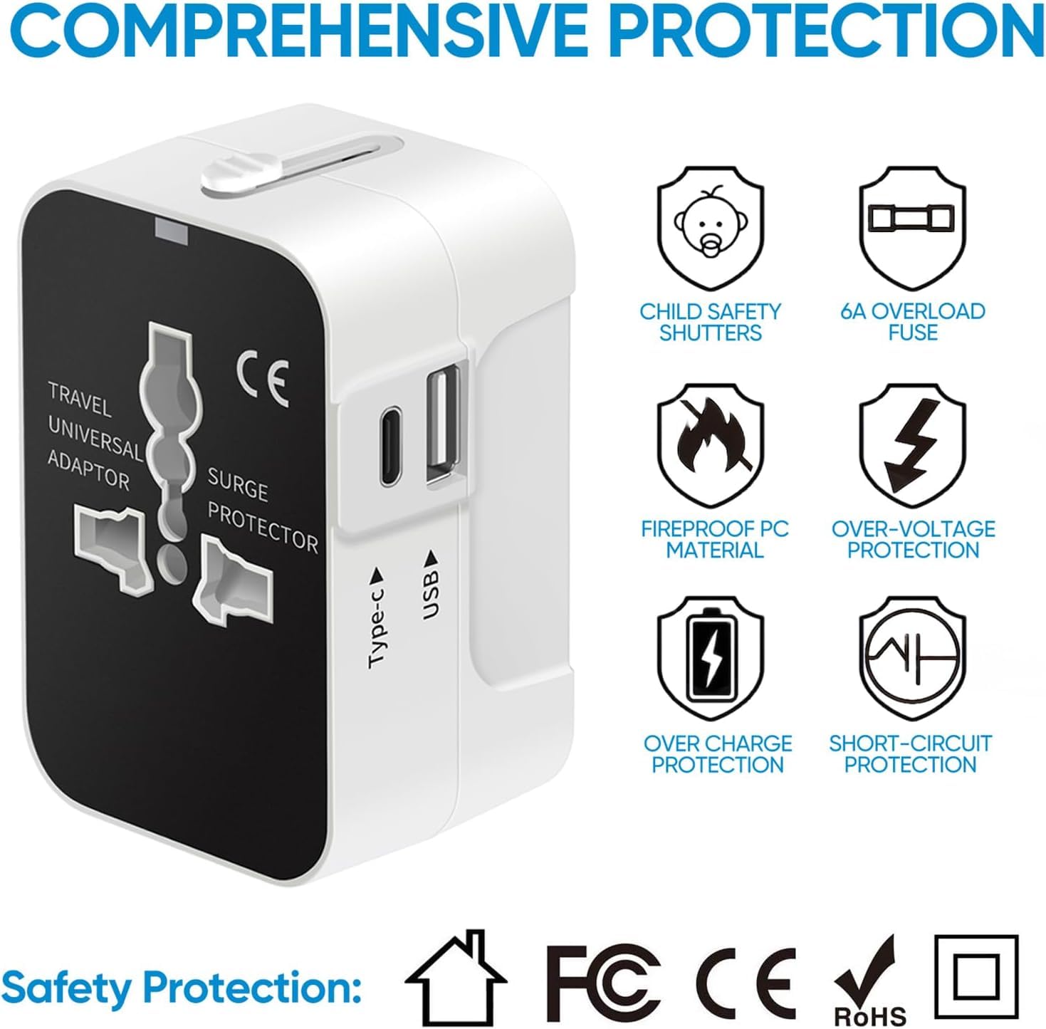 🌐 【 USB-C Smart Charging】 – Our universal travel adapter features Type-C+ USB-A+ Universal AC socket, allowing you to charge your 3 devices simultaneously with High-speed. 2 USB ports with built in IC can detect your multiple devices and deliver fastest possible charging speed. The USB-C port can charge up to 2.4A