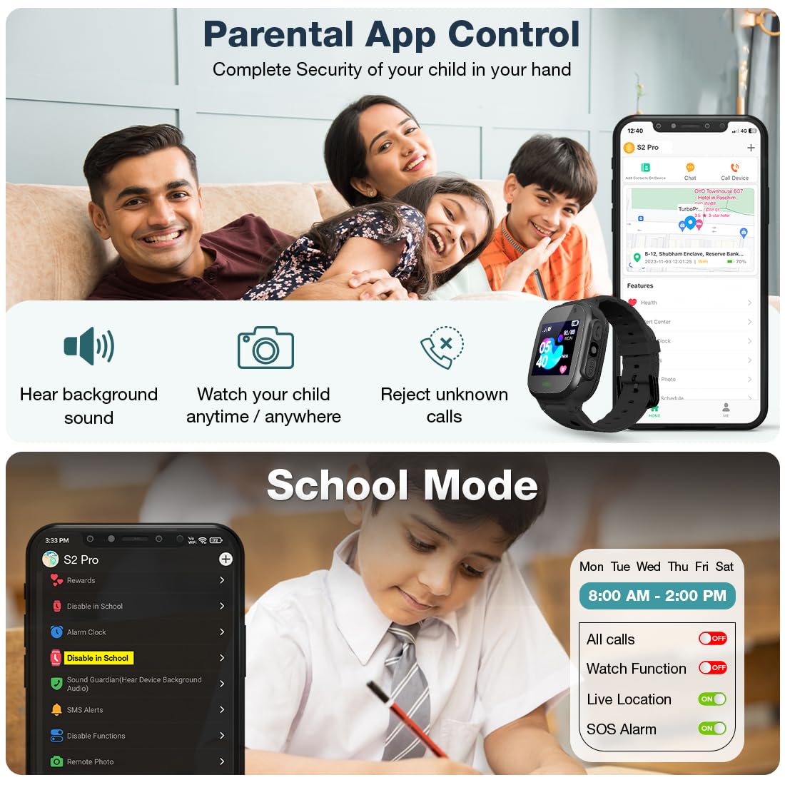 sekyo S2 Pro Calling Smart Watch for Kids | Kids SmartWatch for Boys & Girls | Location Tracking, Camera, SOS, Safe Zone | 4G/5G Sim Card Support | App Control | TXT/Voice SMS | Long Battery -Black