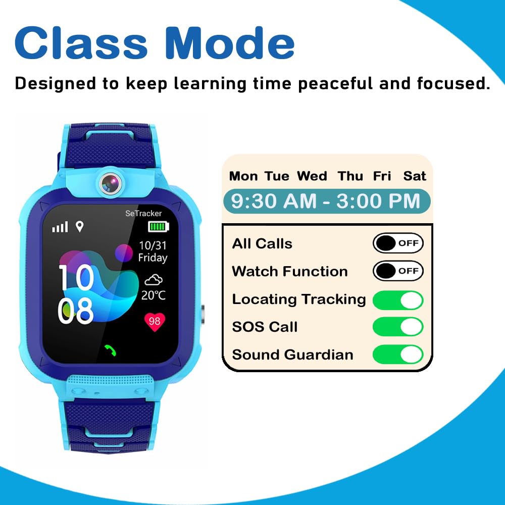 [Class mode (Do not disturb)]: Block all incoming calls and messages during school hours. The watch turns into a silent mode so kids stay focused on studies. Meanwhile, parents can still track the location and use the sound guardian feature for silent safety checks.
