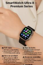 🕒 SmartWatch Ultra 8 – Premium Quality · Bluetooth Calling · Wireless Charging Main Visual: Realistic female hand wearing the watch, shown at a slight angle to highlight both the screen and titanium back sensors. Bright, clean white background with professional lighting for clarity. Key Feature Callouts (positioned around the watch): Bluetooth Calling – in-call icon + text Wireless Charging – small magnet + lightning bolt symbol 24-Day Standby / 7-Day Daily Use – battery gauge HD Touchscreen – colorful app grid (WhatsApp, TikTok, Snapchat…) Durable Design – metallic outline or shield icon Heart Rate Monitor & Fitness Tracking – heart + pulse symbol