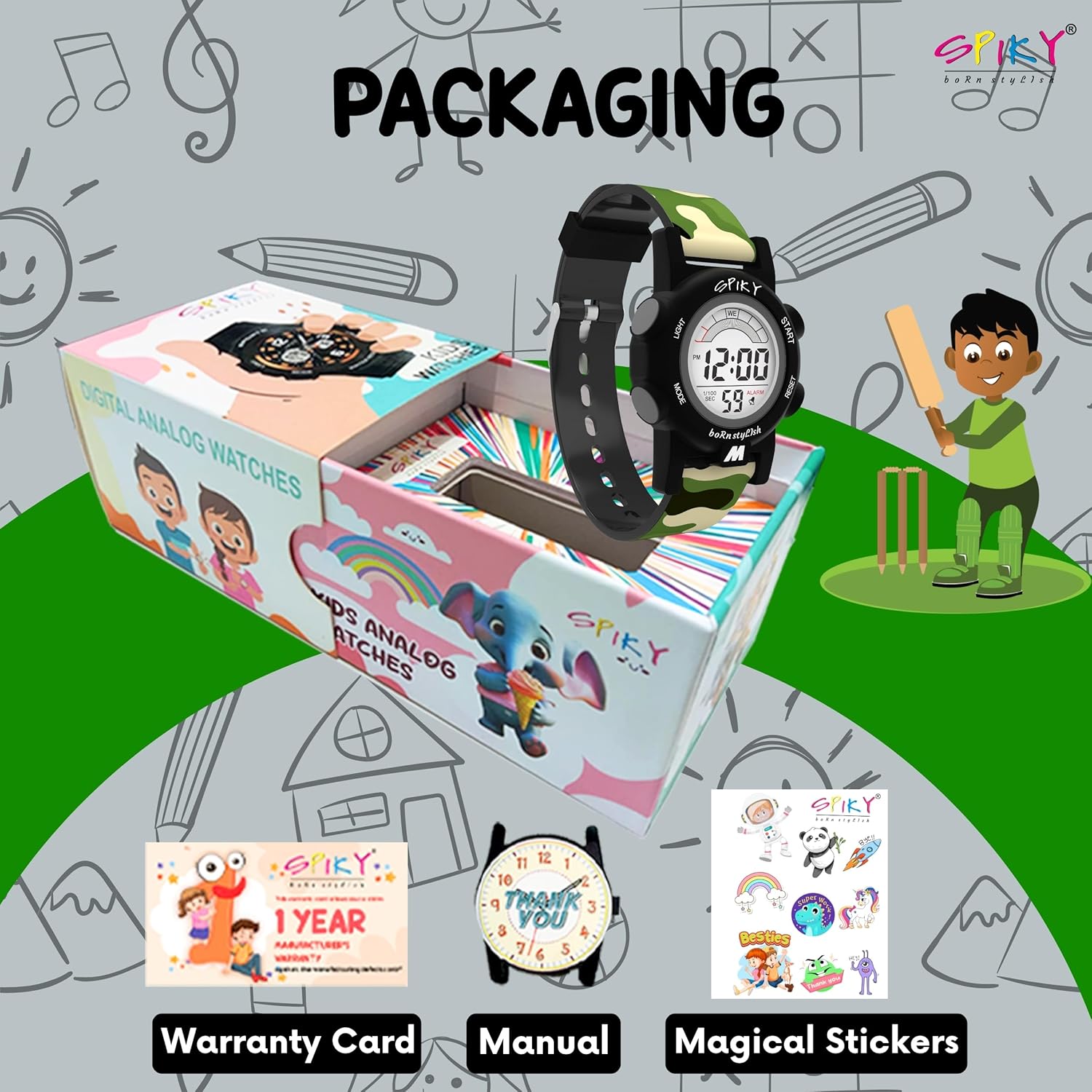 Included Components : 1 Cartoon Sticker, 1 User Manual, 1 Warranty Card, 1 Watch