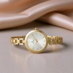 Golden Stainless Steel Strap: Glossy patterned links add a luxurious touch.
