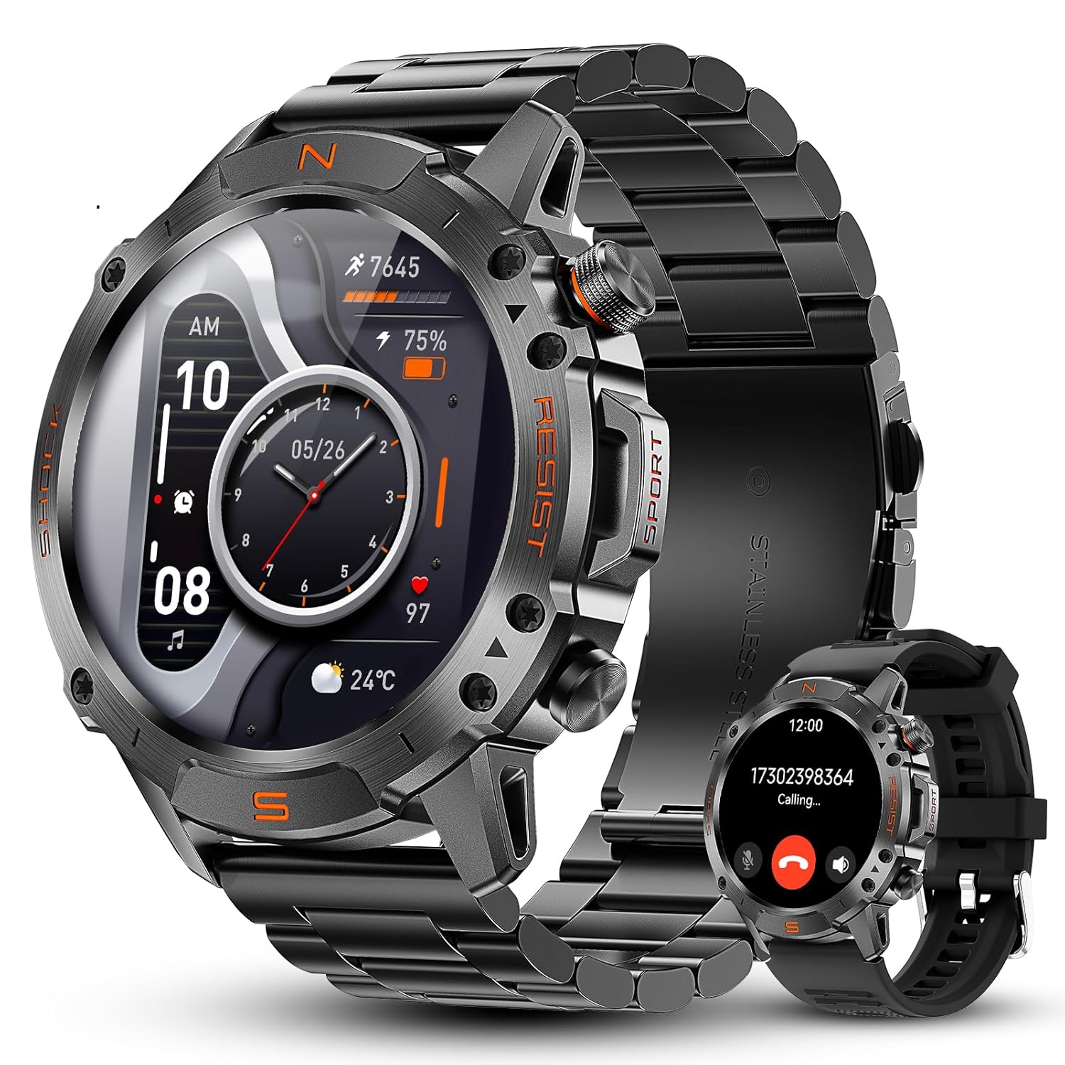 WalkerFit Smart Watch for Men Answer/Dial Calls with 110 Sport Models, IP68 Waterproof Fitness Watch with Heart Rate Monitor, Android Smart Watch for iPhone Compatible, 1.43″ AMOLED Display, Stainless Steel black band